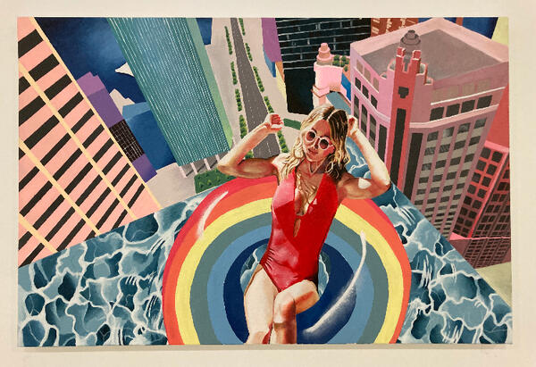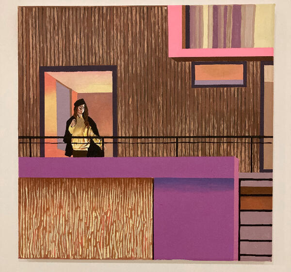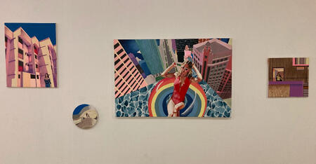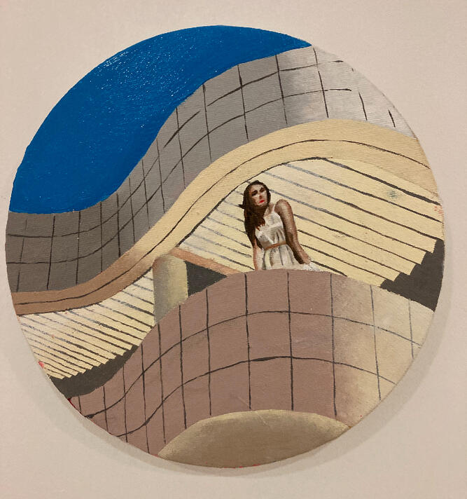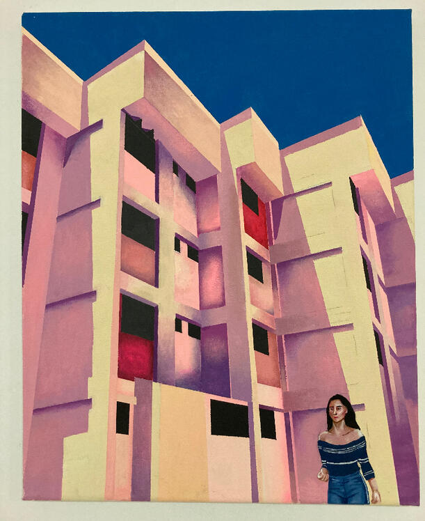 Jonathan was inspired by different architectures and the vibes that they give off. The colours he used are very vibrant and jarring which gives an artificial feeling. The bigger pictures have buildings that are less detailed while smaller pictures have buildings that are more detailed. Shapes of the canvas in the final display are associated with the different architecture and the different canvas sizes and orientation highlights the distinctions between each piece and how the various architecture styles affect behaviour. The geometric shapes and artificial colours used seem man-made and thus less welcoming, which emphasizes how contrived society has become. Arranging the housing buildings at the side while buildings in the centre are more for work shows that careers have become the main part of modern life.