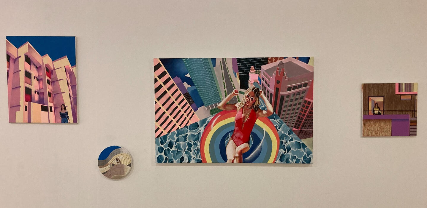 Jonathan was inspired by different architectures and the vibes that they give off. The colours he used are very vibrant and jarring which gives an artificial feeling. The bigger pictures have buildings that are less detailed while smaller pictures have buildings that are more detailed. Shapes of the canvas in the final display are associated with the different architecture and the different canvas sizes and orientation highlights the distinctions between each piece and how the various architecture styles affect behaviour. The geometric shapes and artificial colours used seem man-made and thus less welcoming, which emphasizes how contrived society has become. Arranging the housing buildings at the side while buildings in the centre are more for work shows that careers have become the main part of modern life.